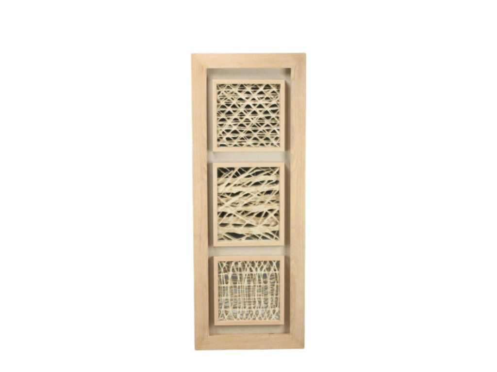 Dekoratívny panel s tromi štvorcovými segmentmi, každý s jedinečným abstraktným vzorom z prírodných vlákien. Rám je z dreva v prírodnom odtieni, čo dodáva celku teplý a prírodný vzhľad. Vhodné ako dominantný prvok na stenu do moderného aj rustikálneho interiéru.