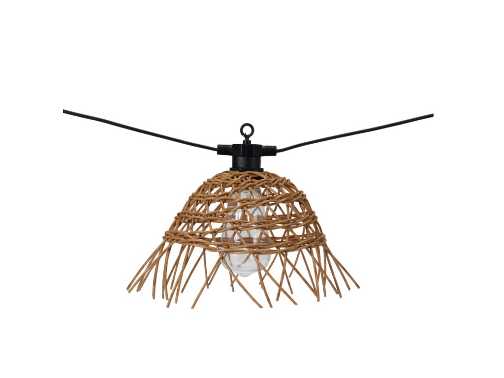 Vonkajšie párty osvetlenie s tienidlami z prírodného rattanu, ideálne na terasu, záhradu alebo altánok. Príjemné teplo-biele svetlo vytvára útulnú atmosféru počas letných večerov.