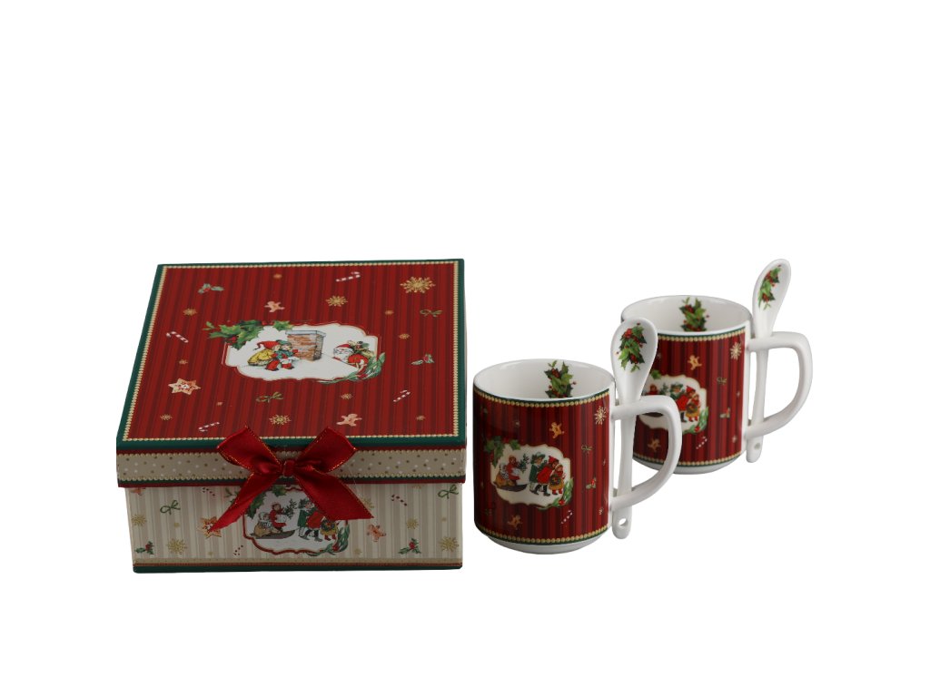 Elegantná sada dvoch porcelánových hrnčekov s lyžičkami v krásnej vianočnej darčekovej krabičke. Hrnčeky majú červený motív s obrázkami a vianočnej výzdoby. Ideálny darček pre milovníkov vianočnej atmosféry a teplých nápojov.