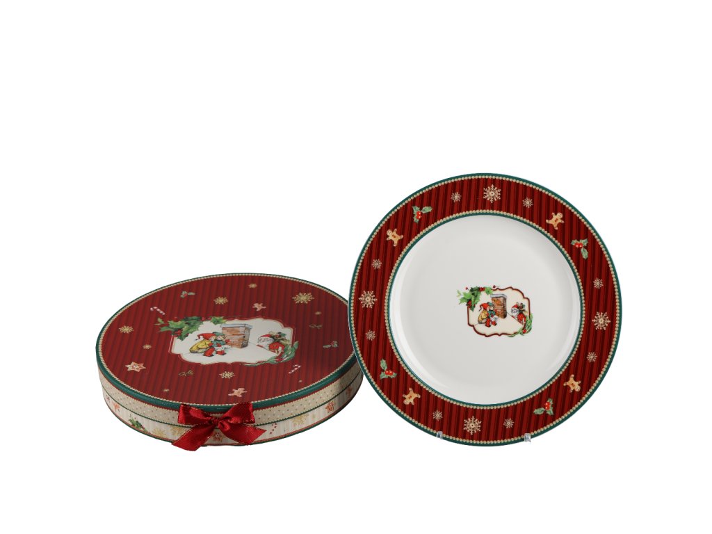 Elegantný porcelánový tanier s krásnym vianočným motívom, zdobený červeným okrajom so snehovými vločkami, medovníkmi a vetvičkami. Ideálny na servírovanie sviatočných dobrôt alebo ako štýlový darček – dodáva sa v ozdobnej darčekovej krabičke s mašľou.