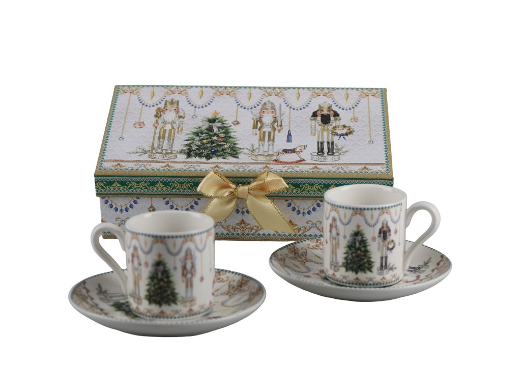Elegantná porcelánová sada dvoch šálok s podšálkami s nádherným vianočným motívom – ozdobené vianočné stromčeky, vojačikovia a zlaté detaily vytvárajú čarovnú sviatočnú atmosféru. Sada je uložená v luxusnej darčekovej krabičke s mašľou, ktorá pôsobí veľmi vkusne a štýlovo.