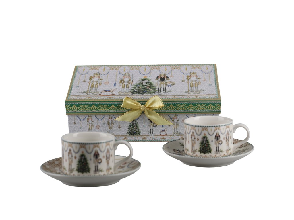 Elegantná porcelánová sada dvoch šálok s podšálkami s nádherným vianočným motívom – ozdobené vianočné stromčeky, vojačikovia a zlaté detaily vytvárajú čarovnú sviatočnú atmosféru. Sada je uložená v luxusnej darčekovej krabičke s mašľou, ktorá pôsobí veľmi vkusne a štýlovo.
