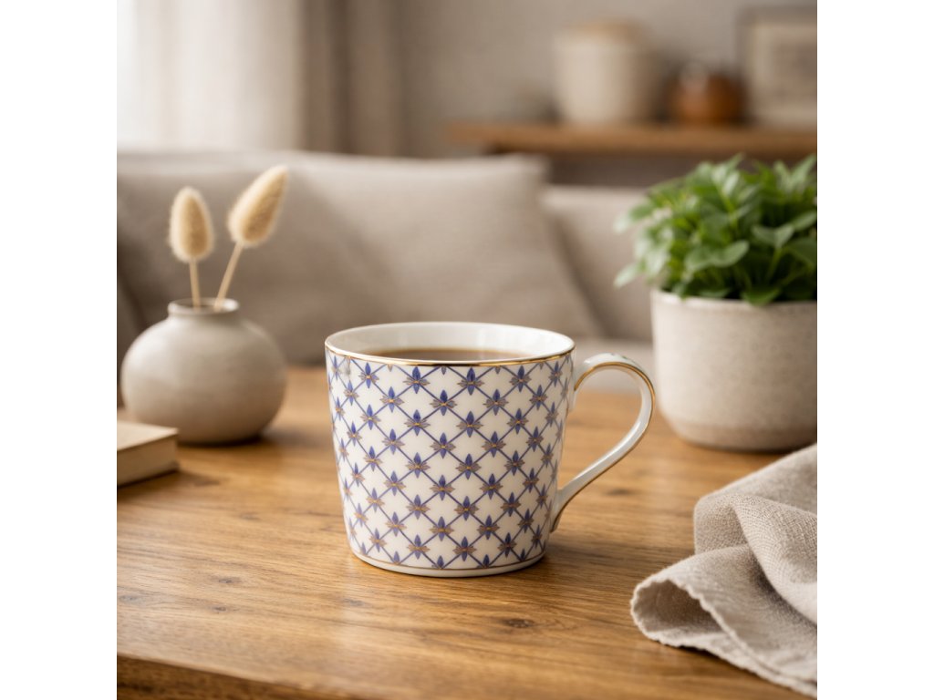 Dodajte svojmu rannému rituálu eleganciu s týmto štýlovým porcelánovým hrnčekom v modro-bielom dizajne. Jemný, tenkostenný porcelán pôsobí ľahko a luxusne, zatiaľ čo zlaté detaily dodávajú hrnčeku výnimočný a noblesný vzhľad. Ideálny na obľúbený čaj či kávu. Hrnček je balený vo vkusnej darčekovej krabičke, ktorá ladí s jeho dizajnom – vďaka tomu je skvelým tipom na darček pre rodinu, priateľov aj kolegov.Dodatočné parametre