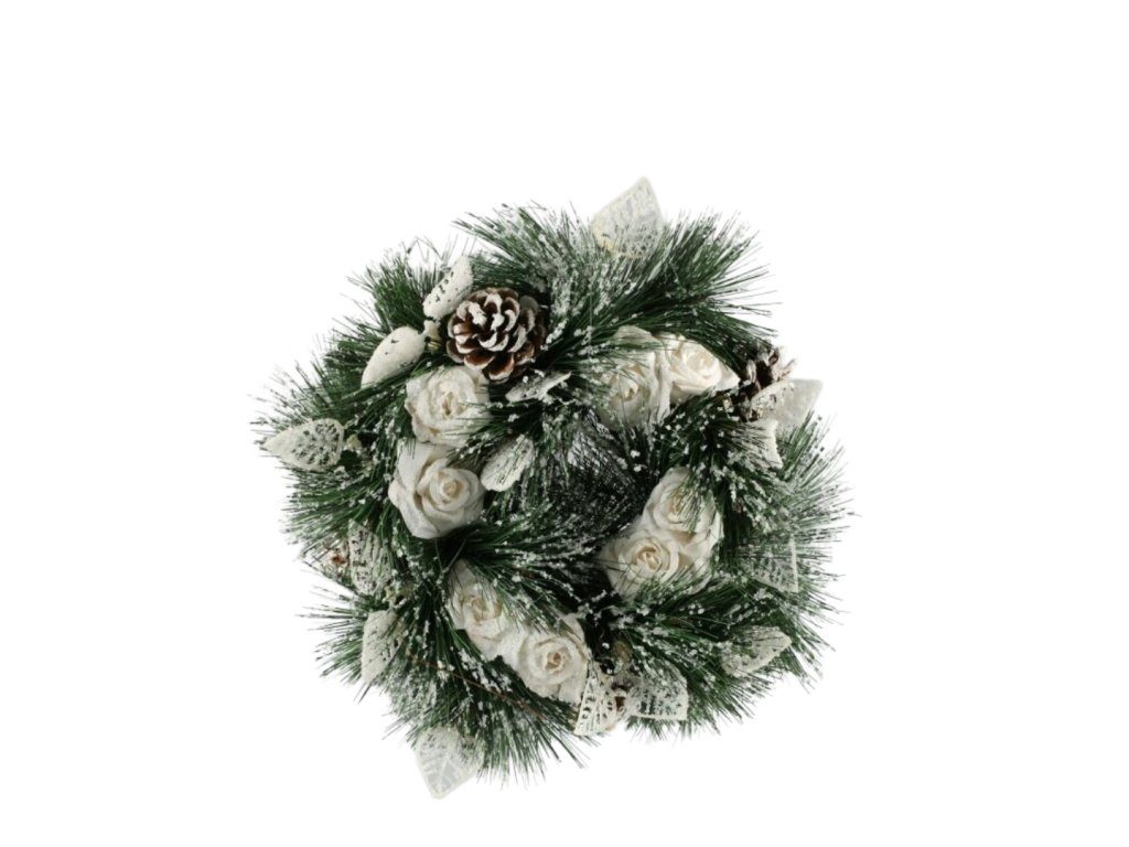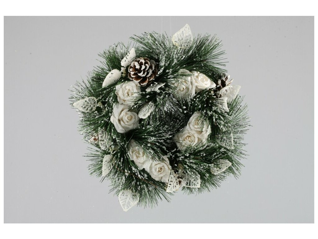 Veniec s ružami a šiškami biely 30cm
