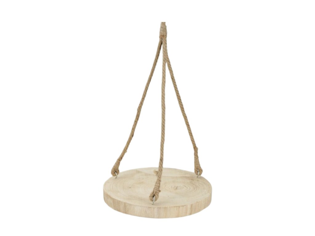 Polička je zavesená na troch pevných jutových lanách, ktoré sú upevnené kovovými okami do dreva a hore sa spájajú do jedného bodu na zavesenie. Vďaka svojmu prírodnému vzhľadu je ideálna do rustikálnych, boho alebo škandinávskych interiérov – môže slúžiť na kvety, dekorácie či drobné predmety.